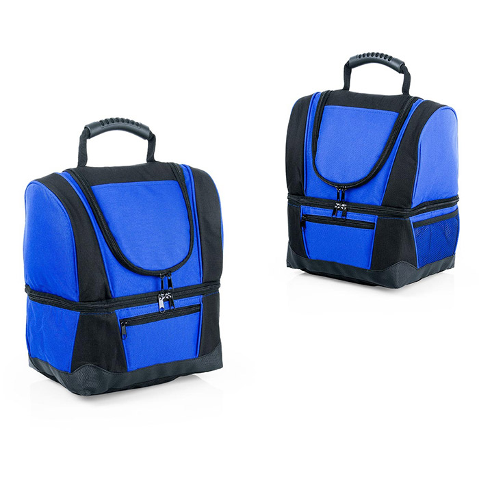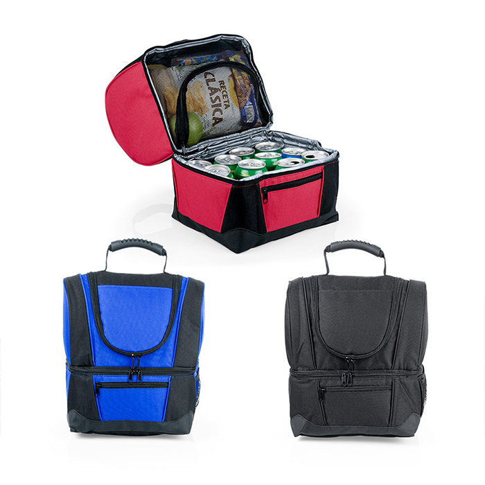 recubrimiento interno y separador en malla de PVC, resistente a la humedad; al exterior bolsillo frontal con cremallera y bolsillo lateral libre en malla. El compartimiento posterior tiene capacidad para llevar hasta 12 latas de bebidas.